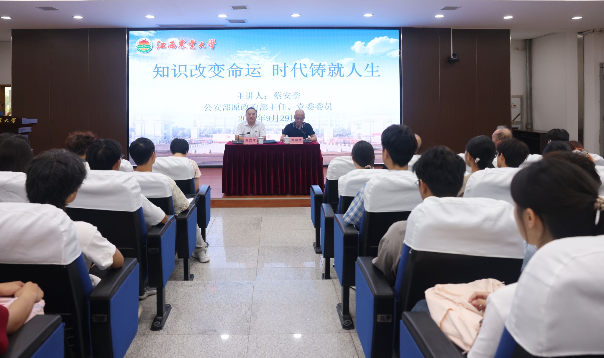 9月29日上午,我校杰出校友、公安部原党委委员、政治部主任蔡安季重返母校,以《知识改变命运 时代铸就人生》为题,为2025级新生们讲授一堂特殊的“开学第一课”。校党委书记黄路生院士主持报告会,校党委副书记周敏丹,副校长张高亮,原副校长王华林,新生代表、辅导员代表、相关部门及学院负责人,共200余人到场聆听。