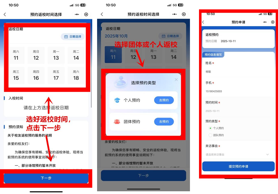 四、预约好以后,驾车入校校友可直接入校,系统自动识别车牌;步行入校有两种方式