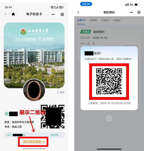 (1)在江农校友之家小程序内,展示二维码扫码入校。
